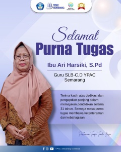 Dalam rangka Purna Tugas Ibu Ari Harsiki,S.Pd yang telah mengabdi sebagai guru SLB,C-D YPAC Semarang selama 31 tahun, untuk Perpisahan ...